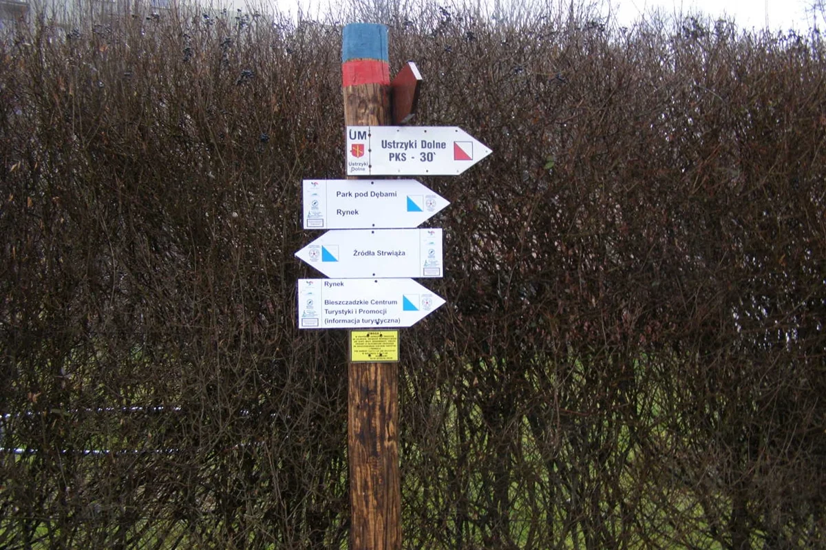 Szlak czerwony do źródeł Strwiąża rozpoczyna się nieopodal dworca autobusowego w Ustrzykach Dolnych. Wiedzie do szczytu Kamiennej Laworty (708 m n.p.m.), następnie do źródeł Strwiąża. Dalej grzbietem Małego Króla (641 m n.p.m) zawraca do Ustrzyk. Po drodze otwierają się wspaniałe widoki na Gromadzyń, Orlik, Ustrzyki Dolne, pasmo Żuków, najbliższe tereny Przedgórza Bieszczadzkiego i zaporę w Solinie. Przy dobrej widoczności widać także pasmo Wysokiego Działu z Wołosaniem i Chryszczatą, a także Beskid Niski.