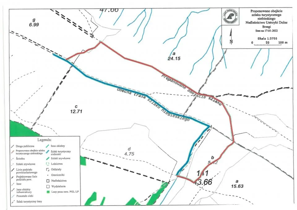 Niebieski szlak prowadzi z miejscowości Ustrzyki Dolne ul. Jasień do miejscowości Brzegi przez szczyty Orlika i Kiń (lokalizacja wg załącznika graficznego - kolor niebieski). Czasowe wyłączenie fragmentu ww. szlaku spowodowane jest planowanym rozpoczęciem prac leśnych z zakresu pozyskania i zrywki drewna w tych wydzieleniach.