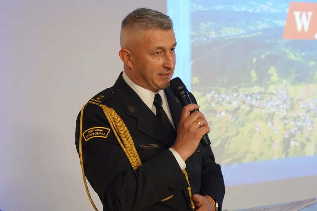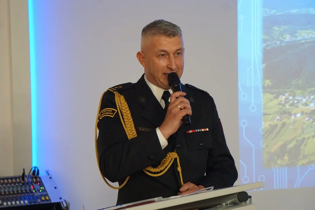 Obecny na uroczystości brygadier Robert Wojciechowski, komendant Powiatowej Państwowej Straży Pożarnej w Lesku, zwrócił uwagę na znaczenie pracy strażaków ochotników.