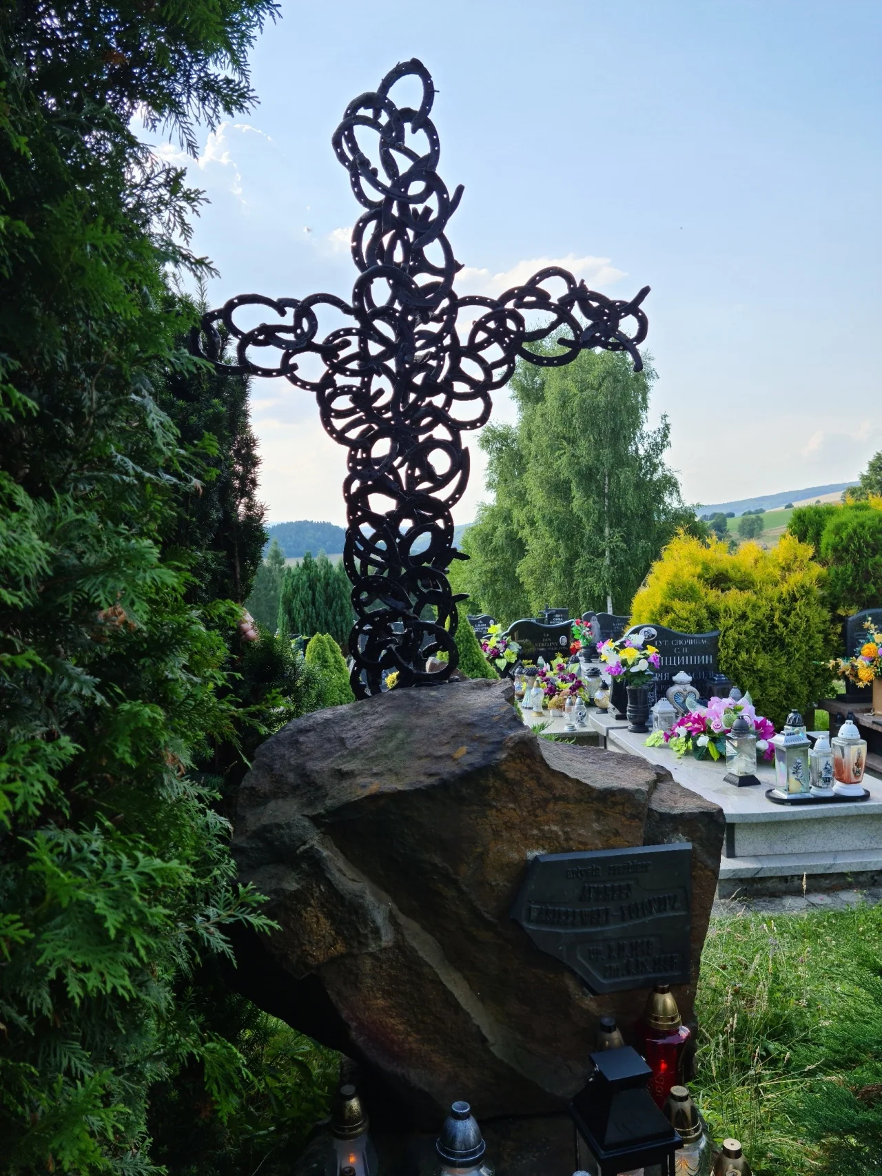 Jego niezwykły grób ozdabia osobliwy krzyż z końskich podków, wykonany przez Romana Mazura "Betona". Na głazie nagrobnym wyryto napis "Słuchałem pieśni strumienia, wycinanej czekaniem na kamieniach"