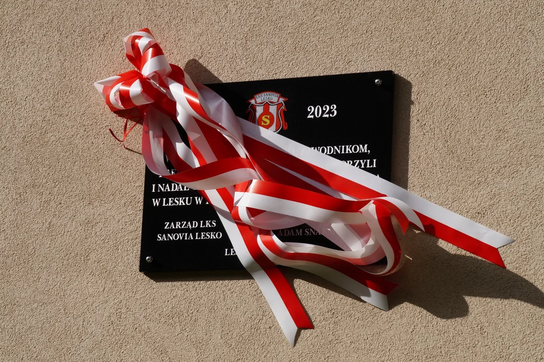 Dopełnieniem jubileuszowych obchodów 100 lat Sanovii Lesko było uroczyste odsłonięcie tablicy pamiątkowej na klubowym budynku przy ulicy Jana Pawła II. Wydarzenie rozpoczęło się od wejścia pocztu sztandarowego, następnie głos zabrał Zbigniew Paszkowski, prezes Sanovii, który pokrótce przypomniał początki funkcjonowania klubu, a chwilę później przed zgromadzonymi wystąpił Adam Snarski, burmistrz Leska. Po przemówieniach, przepełnionymi podziękowaniami i życzeniami pomyślności na dalsze lata, odsłonięto tablicę, którą poświęcił ksiądz prałat Mieczysław Bąk, proboszcz parafii pw. Nawiedzenia Najświętszej Maryi Panny w Lesku.
