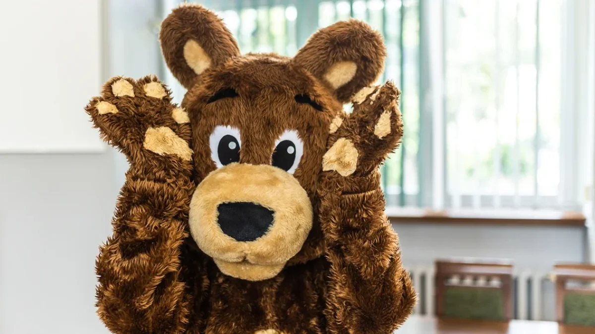 Miś Baryłek bardzo lubi dzieci i z chęcią się z nimi bawi i zbija piąteczki