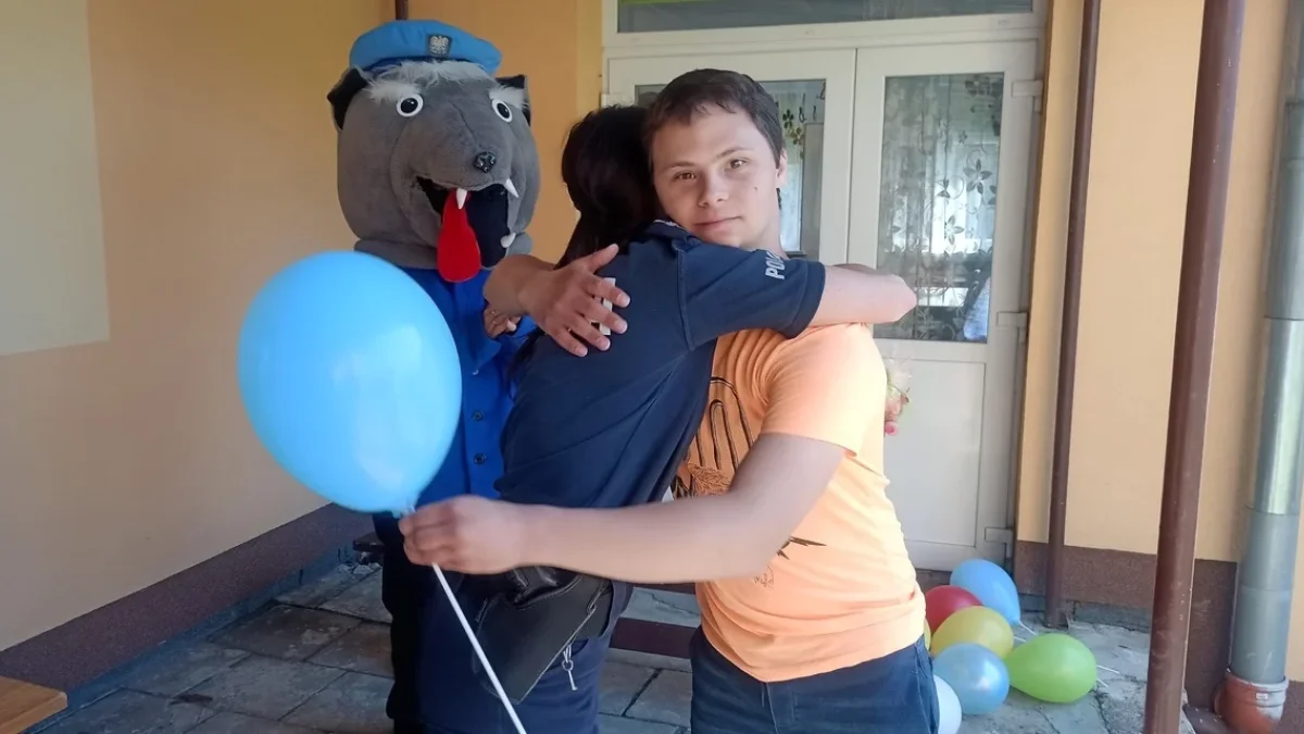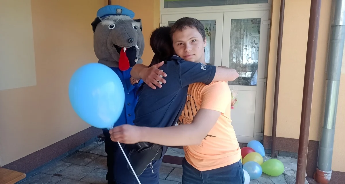 Podczas pogadanki nie zabrakło także tematu dotyczącego sposobu postępowania w przypadku zaczepienia przez obcą osobę, która może poczęstować je słodyczami lub innymi prezentami. W trakcie wizyty funkcjonariuszka przypominała dzieciom również o zasadach bezpiecznego wypoczynku podczas wakacji. Uczestnicy otrzymali od policjantki kolorowe baloniki. Podarunek wywołał na ich twarzach dużo uśmiechu. Każdy z uczestników chętnie pozował do zdjęć z policyjną maskotką - Wyjkiem Wilczkiem.