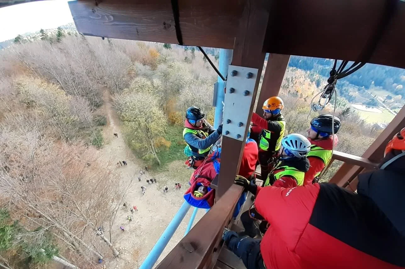 Wieża widokowa na Jeleniowatym, nad miejscowością Muczne, była bazą szkolenia goprowców w zakresie ewakuacji. Ratownicy opracowali plan ewakuacji na wypadek, gdyby ktoś z odwiedzających potrzebował pomocy w momencie znajdowania się w górnej partii wieży. Następnie w ramach ćwiczeń przeprowadzili kilka symulowanych akcji z wykorzystaniem technik linowych.