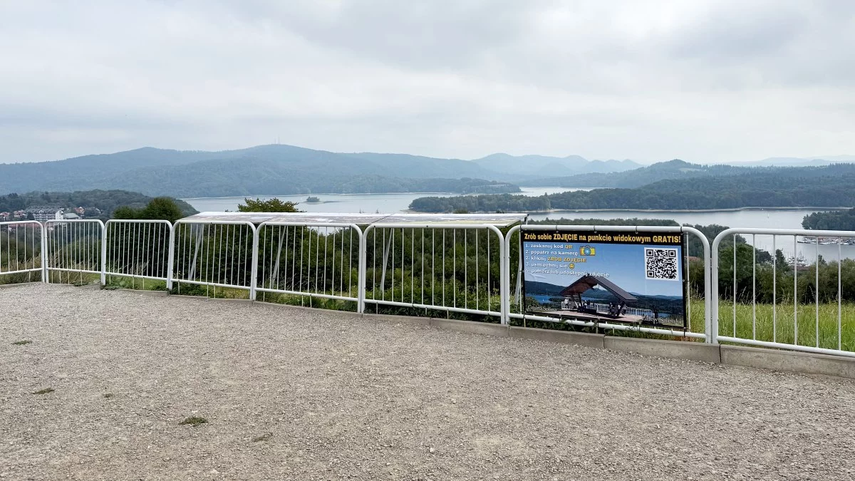 Ciekawym elementem jest kamera zamontowana na punkcie widokowym. To właśnie ona umożliwia wykonanie pamiątkowej fotografii w bardzo prosty sposób. Przy miejscu znajduje się baner z instrukcją. Aby zrobić zdjęcie, wystarczy zeskanować telefonem kod QR, następnie spojrzeć w stronę kamery i kliknąć przycisk „ZRÓB ZDJĘCIE”. Fotografię można pobrać bezpośrednio na swój telefon albo udostępnić w mediach społecznościowych.Choć najlepsze zdjęcia wciąż powstają przy użyciu własnego aparatu czy smartfona, rozwiązanie to stanowi ciekawą propozycję. Daje możliwość wykonania pamiątkowego ujęcia nawet wtedy, gdy nie mamy przy sobie sprzętu fotograficznego lub nie możemy liczyć na pomoc innej osoby.