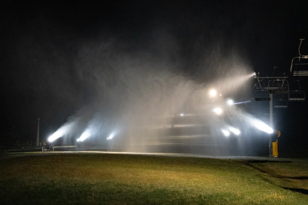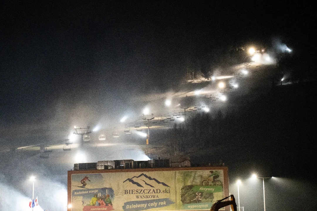 Centrum Turystyki Aktywnej i Sportu Bieszczad.ski w Wańkowej, największa i najnowocześniejsza stacja narciarska w województwie podkarpackim, rozpoczęła intensywne przygotowania do zimowego sezonu. Na stokach uruchomiono armatki śnieżne, które wytwarzają sztuczny śnieg, a proces naśnieżania trwał zarówno wczorajszego wieczora, jak i dzisiejszego poranka. Jak wyjaśnia nam Mariusz Hebda, kierownik Działu Techniczno-Inwestycyjnego Bieszczad.ski w Wańkowej, utrzymanie temperatury na poziomie około -4 stopni Celsjusza pozwala kontynuować naśnieżanie.