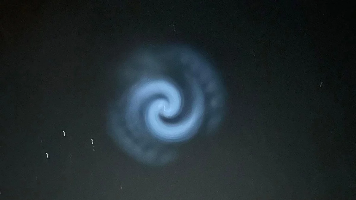 Proces deorbitacji drugiego stopnia Falcona 9 wymaga opróżnienia zbiorników z pozostałym paliwem. W przestrzeni kosmicznej, na wysokości kilkuset kilometrów nad Ziemią, nie ma atmosfery, dlatego wyrzucone gazy nie ulegają chaotycznemu rozproszeniu, lecz mogą tworzyć symetryczne, uporządkowane struktury. Jak tłumaczy Karol Wójcicki, popularyzator astronomii z profilu „Z głową w gwiazdach”, jeśli w tym czasie rakieta dodatkowo obraca się wokół własnej osi, wypuszczone paliwo może układać się w spiralny kształt. Dodatkowo, jeśli Słońce wciąż oświetla przestrzeń kosmiczną, wir staje się widoczny na ziemskim niebie w postaci jasnej, świetlistej spirali. Ekspert przyznał, że choć zrzuty paliwa nie są rzadkością, to w tym przypadku samo miejsce i czas ich wykonania były niezwykłe.