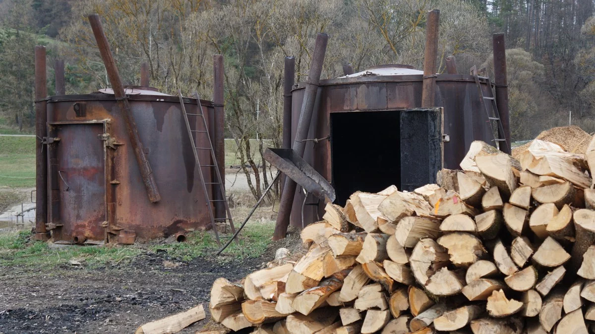 Na wypale w Radoszycach mamy kilka nowości. Oprócz retor klasycznych do wypału węgla drzewnego, mamy też beczkę pirolizową, taką troszeczkę nowocześniejsza technologię, mamy też oryginalne namioty do składowania węgla drzewnego ze Szczerbanówki z legendarnego wypału i z tego samego wypału mamy też barak socjalny, który w tym roku będzie włączony w ekspozycję