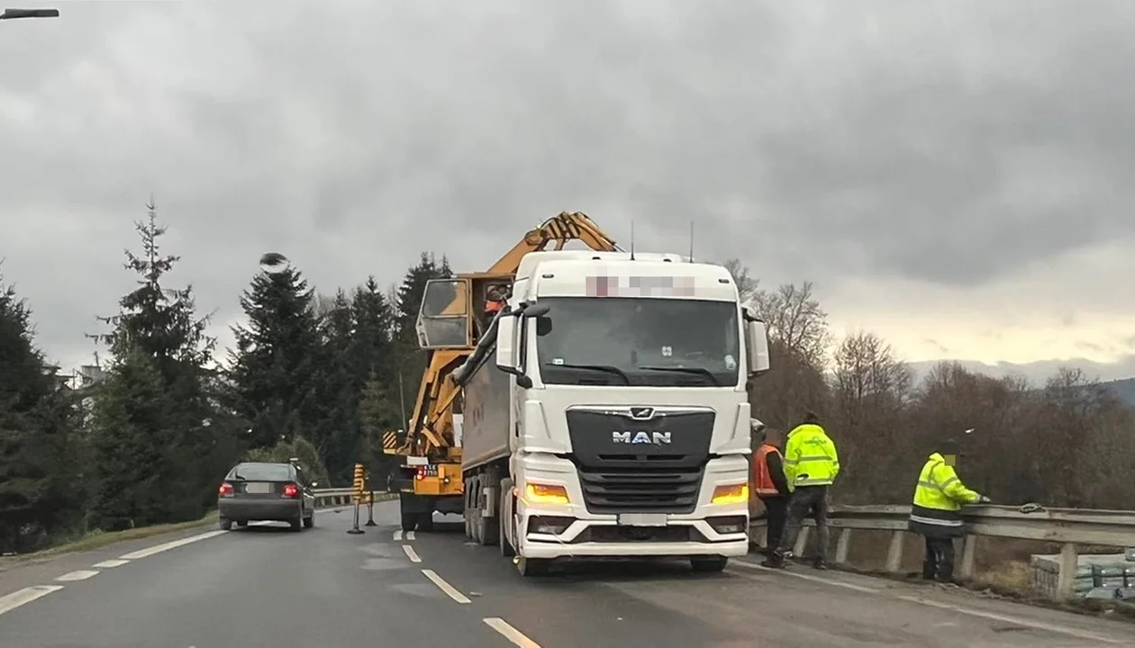 Do zdarzenia doszło dzisiaj przed godziną 11:00 w Lesku. Naczepa samochodu ciężarowego jadącego drogą krajową od strony Sanoka w kierunku Ustrzyk Dolnych osunęła się z jezdni, przez co dalsza jazda była niemożliwa. Na miejscu pojawili się policjanci, którzy do około godziny 15:15 kierowali ruchem.