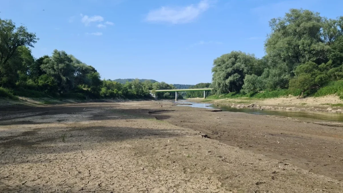 W miejscu, gdzie jeszcze niedawno płynęła rzeka, teraz można przejść suchą stopą po dnie. Brak większych opadów i wysoka temperatura przyczyniły się do dramatycznego spadku poziomu wody w Sanie w okolicach miejscowości Rajskie.