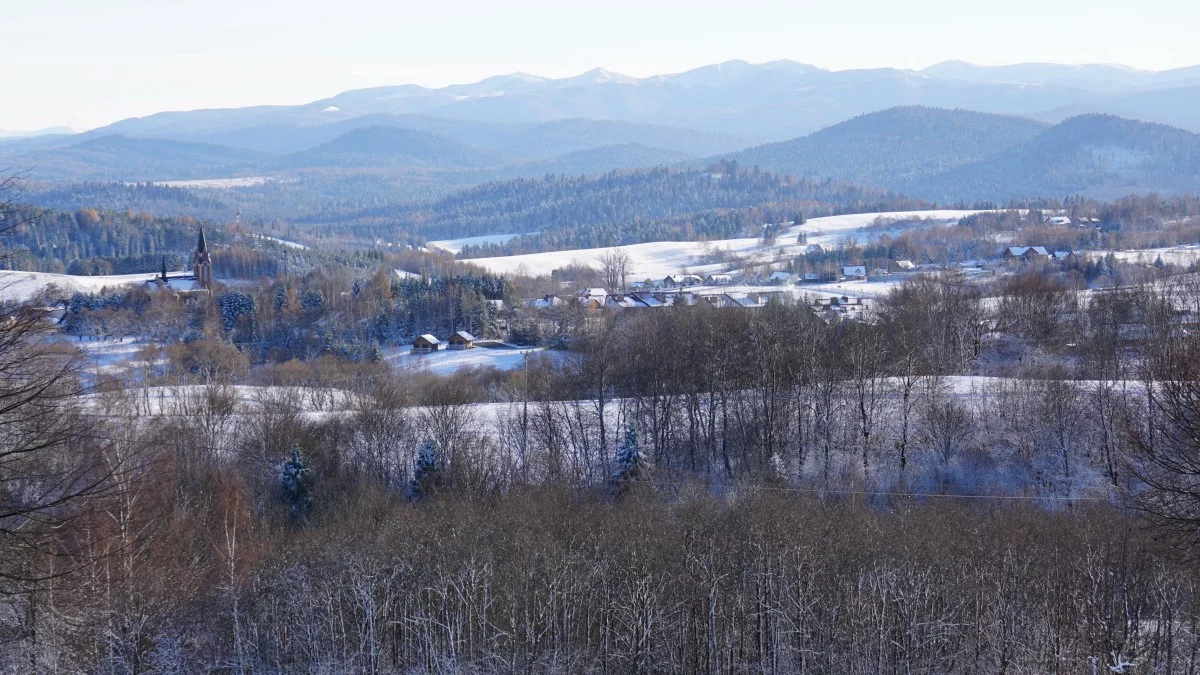 U podnóża gór widoczne są także same Lutowiska, co dopełnia krajobraz i pozwala łatwo zorientować się w przestrzeni.