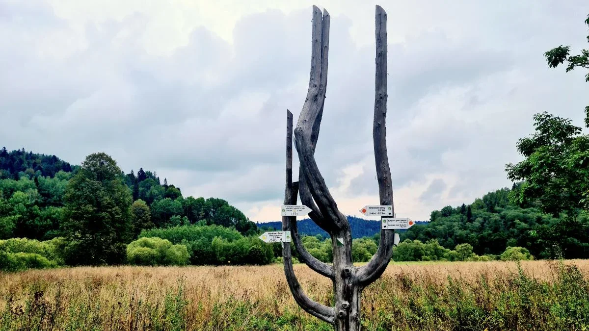 Po odwiedzeniu Grobu Hrabiny kontynuujemy naszą wędrówkę w kierunku źródeł Sanu. Po około półgodzinnej wędrówce dotrzemy na wzgórze Wierszek, które wznosi się na wysokość 871 metrów n.p.m. Znajduje się tu punkt widokowy, z którego roztacza się panorama na nadal zamieszkałe Sianki po stronie ukraińskiej oraz na Przełęcz Użocką. To idealne miejsce, by usiąść na chwilę i oddać się chwili refleksji nad historią tego regionu. Po odpoczynku kontynuujemy naszą wędrówkę do źródeł Sanu. Trasa od Grobu Hrabiny do miejsca, gdzie San bierze swój początek, wynosi około 2,2 km i co zajmuje około 45 minut marszu. Ostatecznie dotrzemy do polany, na której znajduje się obelisk z tablicą, na której cyrylicą napisano, że tutaj znajduje się początek rzeki San, krzyż i słupki graniczne. Nieopodal, kilka metrów poniżej spod buka wypływa źródełko, które umownie jest początkiem tej jakże ważnej dla regionu rzeki. Dlaczego umowne? Ciekawostki na temat źródła Sanu przeczytasz w artykule pt. "Źródło Sanu", a gdzie to jest?"