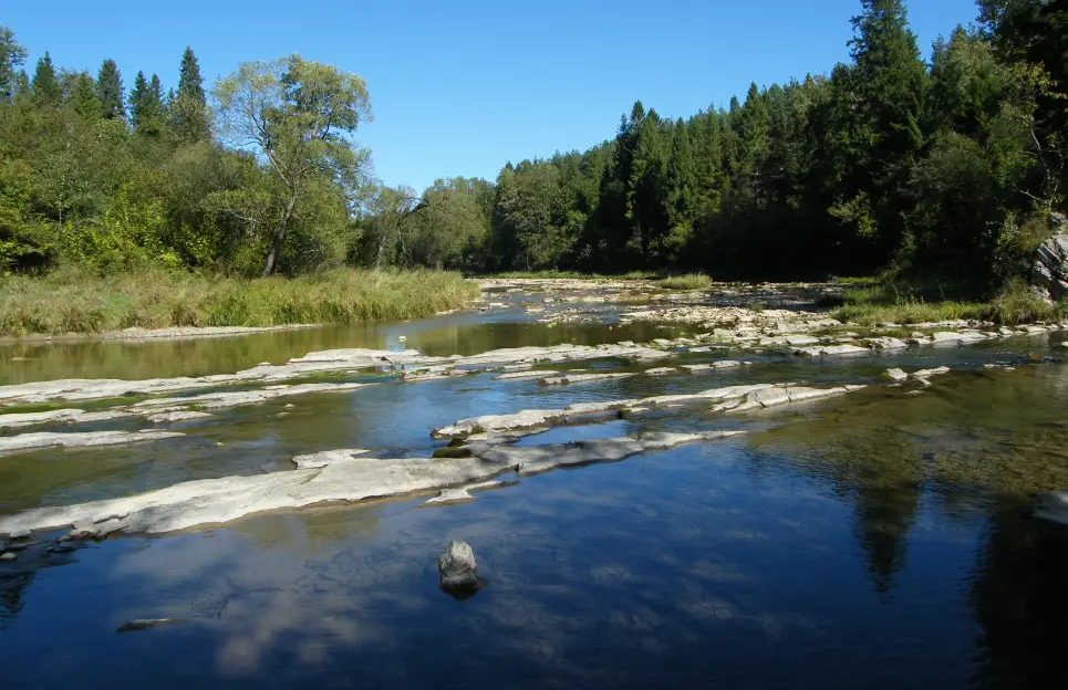 Z tego parkingu schodzimy na brzeg Sanu. I już widzimy styk dwóch rzek. Wody Wołosatego wpadają do Sanu. Miejsce jest bardzo ciekawe o każdej porze roku i przy różnym poziomie wód. Możemy tu bez problemu przyjść z dziećmi. Latem można pobrodzić dla ochłody w zimnej wodzie Sanu, przysiąść na skałach i podziwiać bieszczadzką przyrodę.