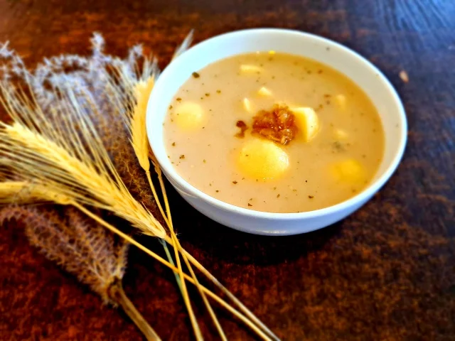Gotujemy wodę. W tym czasie ziemniaki kroimy w kostkę. Wrzątek solimy, dodajemy ziemniaki i gotujemy do miękkości ziemniaków (ok. 20 minut). Dodajemy drobniutko posiekany czosnek i wlewamy sok z kiszonej kapusty (ilość zależy od naszych preferencji). W 100 ml zimnej wody rozprowadzamy 3 łyżki mąki owsianej i wlewamy do garnka. Doprawiamy solą i pieprzem do smaku.