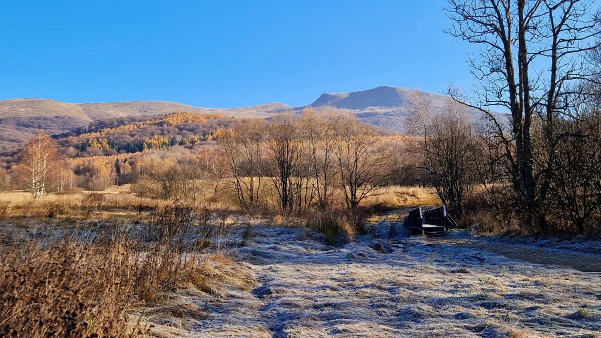Dzisiejszy mroźny poranek w Bieszczadach stworzył piękny klimat. W okolicach Mucznego, Wetliny i Ustrzyk Górnych termometry pokazywały średnio -7 stopni Celsjusza, co w połączeniu z przymrozkiem i wschodzącym słońcem stworzyło wyjątkowy krajobraz. Na czystym niebie rozgrywał się spektakl barw – jeszcze jesienne kolory, kontrastowały z bielą porannego przymrozku.