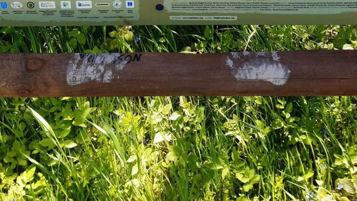 Pracownicy Nadleśnictwa Lutowiska podzielili się fotografią, na której widać odciski łapek niedźwiadka na drewnianej barierce przy tablicy informacyjnej.