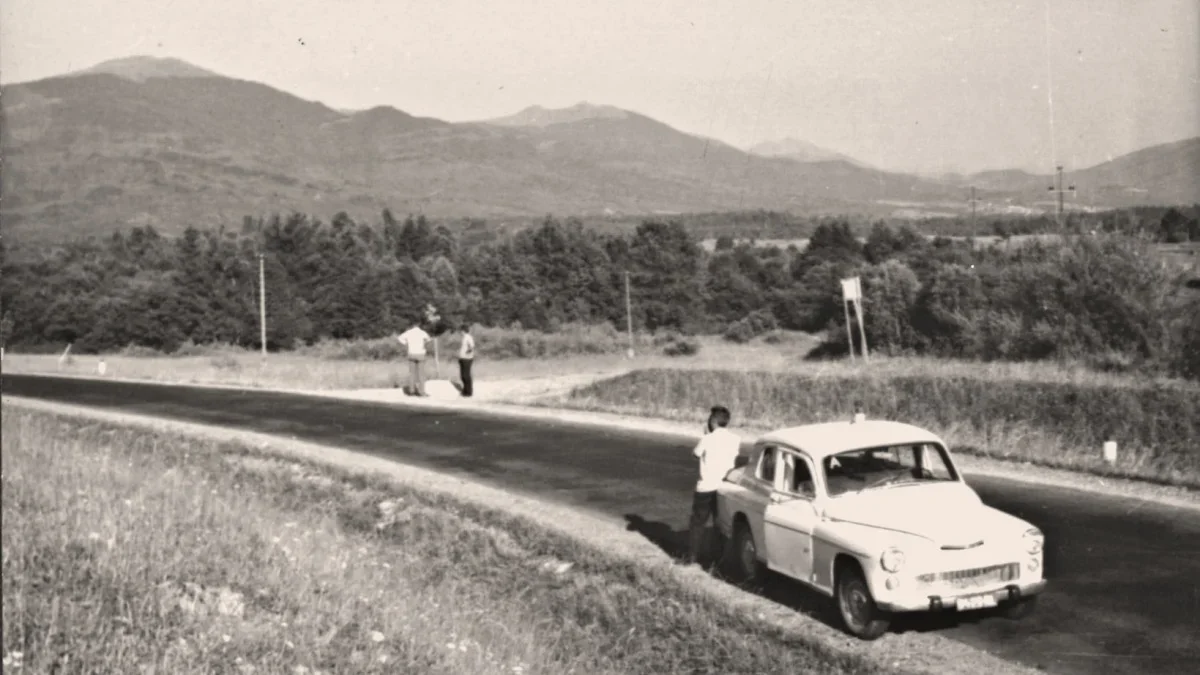 Klimatyczne zdjęcie ukazujące Bieszczady sprzed półwiecza. Widzimy na nim panoramę z przełęczy Przysłup w kierunku południowo wschodnim. Oczywiście każdy miłośnik tych gór bez trudu rozpozna bardzo charakterystyczne sylwetki Smereka, Hnatowego Berda oraz Połoniny Caryńskiej. Zdjęcie otrzymałem nieopisane, toteż trudno precyzyjnie ustalić rok jego wykonania. Z pewnością nie są to już lata pięćdziesiąte. Niemniej fakt, że szosa na której stoi samochód jest jeszcze w idealnym stanie wskazuje na drugą połowę lat sześćdziesiątych lub początek siedemdziesiątych. Taką szosę z tamtego okresu zapamiętałem (biel słupków drogowych, wyżwirowane pobocza, gładka i ciemna jeszcze nawierzchnia).