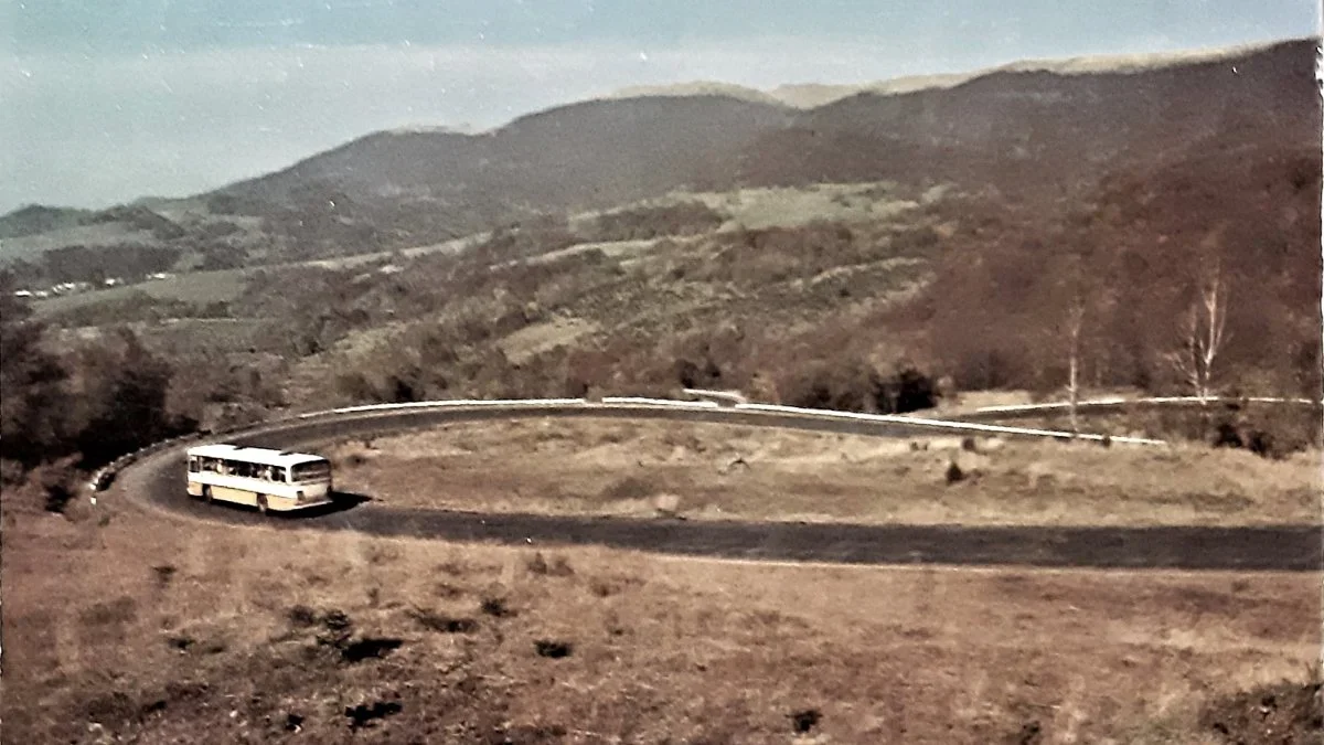 Zakręt pokonuje autobus marki Sanos, jeden z następców słynnego Jelcza-ogórka na bieszczadzkich szosach. Prawdopodobnie jest to autokar turystyczny, nie widać bowiem znaczka firmy PKS, którym oznakowane były autobusy kursowe. Dodam w tym miejscu, że turyści pokonywali pieszo te serpentyny korzystając ze ścieżki wiodącej na prost („na szagę”), przecinającą wszystkie te zakręty.