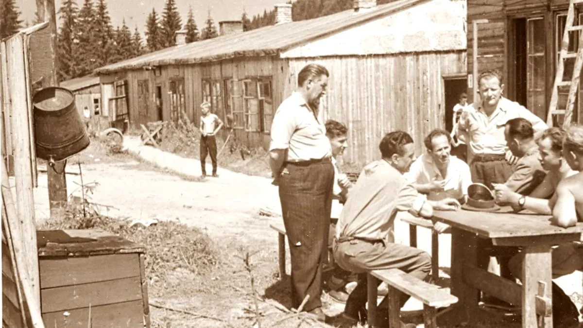 Uwieczniono na zdjęciu trójstronne spotkanie (w albumie opisane jako "konferencja na wolnym powietrzu"), pracowników Lasów Państwowych oraz przedstawicieli wojska i junaków OHP, czyli budowniczych kolejki i szosy. Wychudzony, kilkunastoletni zapewne junak z OHP, stojący na dalszym planie, daje nam pewne wyobrażenie o tym, jakimi min. "siłami" wtedy dysponowano.