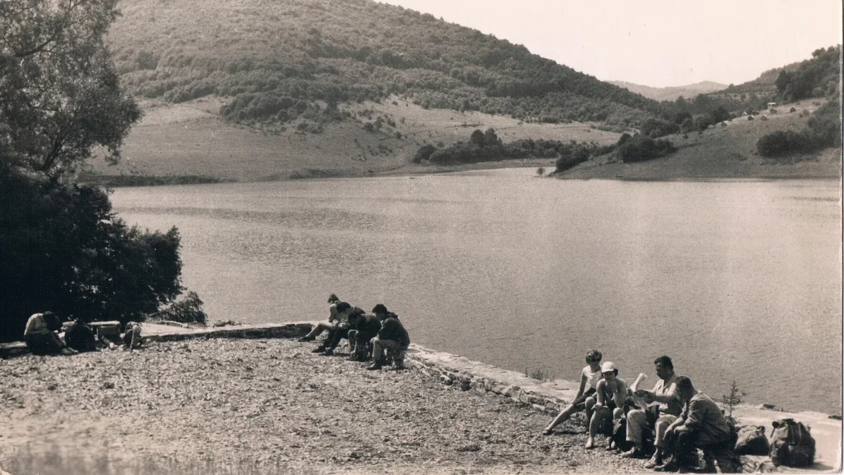 Ówcześnie Jezioro Myczkowieckie było jedynym sztucznym zbiornikiem w Bieszczadach, bowiem w Solinie trwały wtedy prace przy budowie zapory. Nie było jeszcze drogi łączącej późniejszą Solinę z Myczkowem. Dlaczego późniejszą? Obecna Solina znajduje się na terenie niegdyś będącym częścią wiosek Zabrodzie i Bóbrka. Stara Solina została zalana wodą, a w miejscu tej współczesnej istniało wówczas osiedle dla pracowników zatrudnionych przy budowie nowej zapory.Po drugiej stronie widocznego na zdjęciu zalewu możemy dostrzec miejsce, gdzie wpływa do niego potok Bereżnica – dawniej istniała tam wioska Bereżnica Niżna. Ujęte w kadrze łąki nad zalewem – słabo jeszcze zagospodarowane turystycznie – należały do wiosek: Myczkowce i Bereżnica Niżna. Po lewej stronie widzimy stoki góry Berdo, po prawej natomiast Grodzisko. Pomiędzy nimi, na najdalszym planie widoczne są zachodzące na siebie częściowo wzgórza: Kiczera i Wierchy, a w tle najwyższa z widocznych – Korbania.