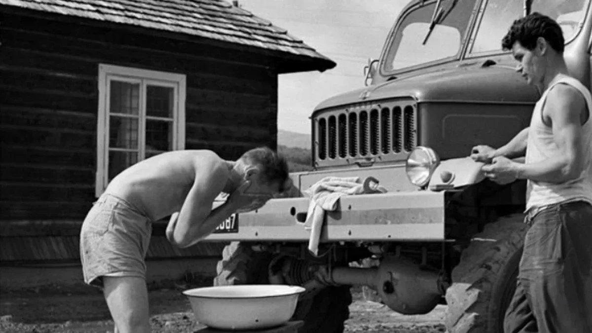 Na zdjęciu uchwycono poranną toaletę dwóch młodych mężczyzn, którzy prawdopodobnie przygotowują się do ciężkiego dnia pracy w lesie. Ten codzienny rytuał odzwierciedla proste, ale zarazem trudne życie ludzi, dla których las był nie tylko miejscem pracy, ale i częścią codziennego bytu. Praca związana z transportem drewna była niełatwa i wymagała dużej siły fizycznej oraz umiejętności technicznych. Wspomniana czechosłowacka „Praga” była popularnym w tamtych czasach środkiem transportu, niezastąpionym w przewożeniu drewna przez trudne, górzyste tereny Bieszczadów. Kierowca i jego pomocnik, uchwyceni na zdjęciu, prawdopodobnie należeli do ekipy zajmującej się codziennym transportem drewna, stanowiąc integralną część tamtejszej społeczności pracowników leśnych.