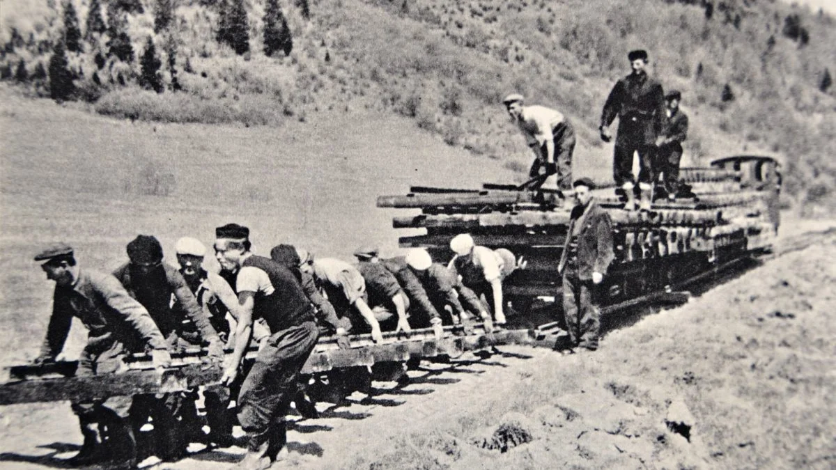 Zdjęcie z lat 50. XX w. na którym utrwalono ciężką pracę ekipy, budującej torowisko kolejki.