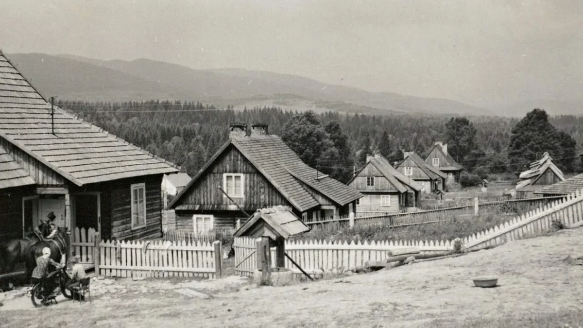 I tak właśnie wyglądało ówczesne Stare Sioło, dziewięć budynków zaledwie i barak zwany hotelem robotniczym w miejscu dzisiejszego schroniska PTTK. Dla porównania dodam, że przed wojną istniało w tej części Wetliny aż 52 gospodarstwa. W czasie, gdy robiono to zdjęcie wieś powiększyła się już o kolejnych czternaście obiektów murowanych, w tym szkołę podstawową, budynek mieszczący dwa sklepy oraz klubokawiarnię. W głębi, pomiędzy dwoma pierwszymi od lewej budynkami widzimy jeden z tychże domów murowanych.
