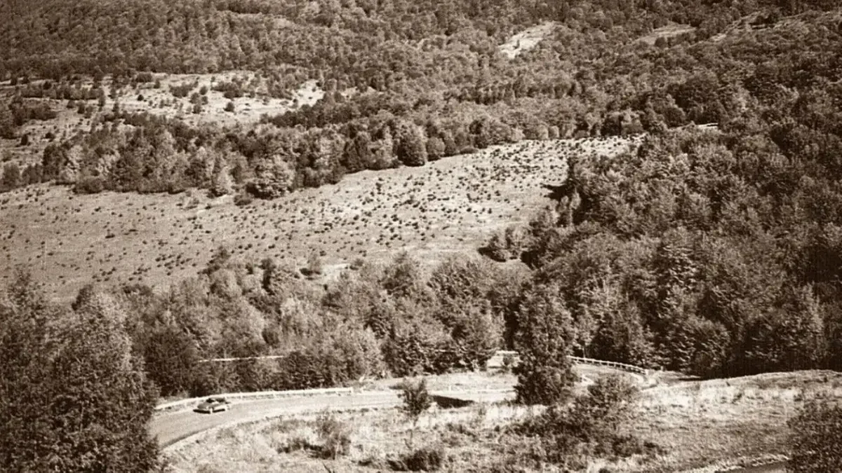 Gładką szosą, błękitną na oryginalnym zdjęciu, wspina się samotnie niewielki samochód. Prawdopodobnie jest to Skoda Octavia lub Wartburg. Były to dosyć popularne wtedy pojazdy. Gdy spojrzymy jeszcze w głąb tej panoramy, ujrzymy rozległe jeszcze wtedy polany na stokach Połoniny Wetlińskiej. Tam dawni mieszkańcy Wetliny koszarowali swoje stada krów wypasanych na połoninach, koszono też trawę na siano. Pozyskiwano wtedy również siano na samych połoninach, które także nie użytkowane przez pasterzy, niezmiernie powoli, lecz nieubłaganie zaczęły zarastać.