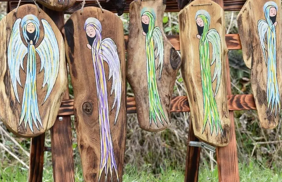 Część powracających aniołów była zielona, żółta, niebieska albo czerwona. To anioły wracające z Bieszczadów tak zakochały się w ich pięknie, że przybrały kolory, które je otaczały - niebieskiego nieba i wód, żółtych i czerwonych lasów bukowych oraz zieleni traw.