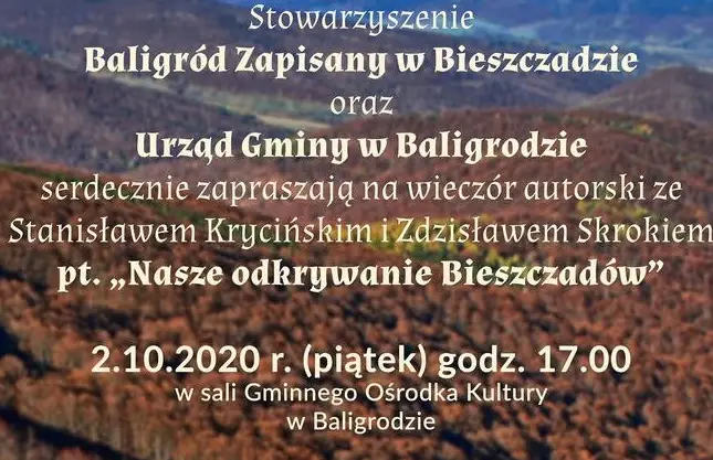 Bohatermi spotkania "Nasze odkrywanie Bieszczadów" będą Stanisław Kryciński i Zdzisław Skrok. Wieczór autorski odbędzie się już w najbliższą sobotę, 2 października o godz. 17:00 w Gminnym Ośrodku Kultury w Baligrodzie.