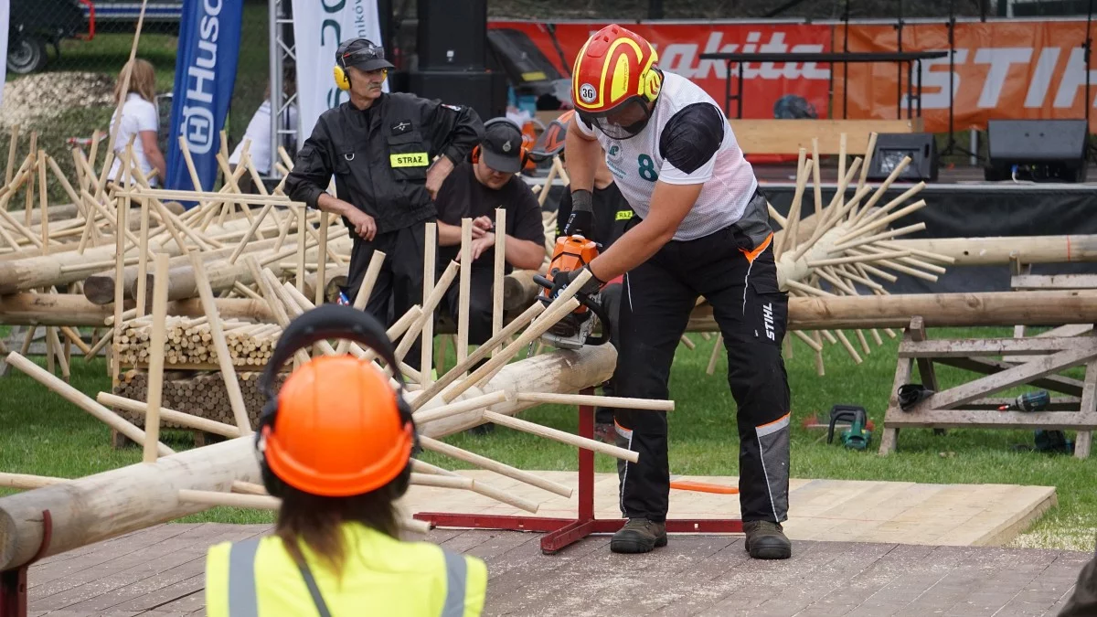 Jedną z kluczowych i najbardziej widowiskowych konkurencji była ścinka drzewa na wyznaczony punkt – tak, by kilkunastometrowy pień opadł dokładnie w miejscu wskazanym przez zawodnika. Zadanie to wymagało nie tylko sprawnej obsługi pilarki, ale też doświadczenia i wyobraźni przestrzennej. Każdy błąd – od przekroczenia limitu czasu (3 minuty) po nieprawidłowe zachowanie zasad bezpieczeństwa – skutkował punktami karnymi.