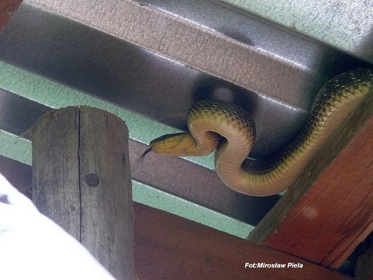 Zobacz, jak wąż eskulapa postanowił schronić się pod zadaszeniem.