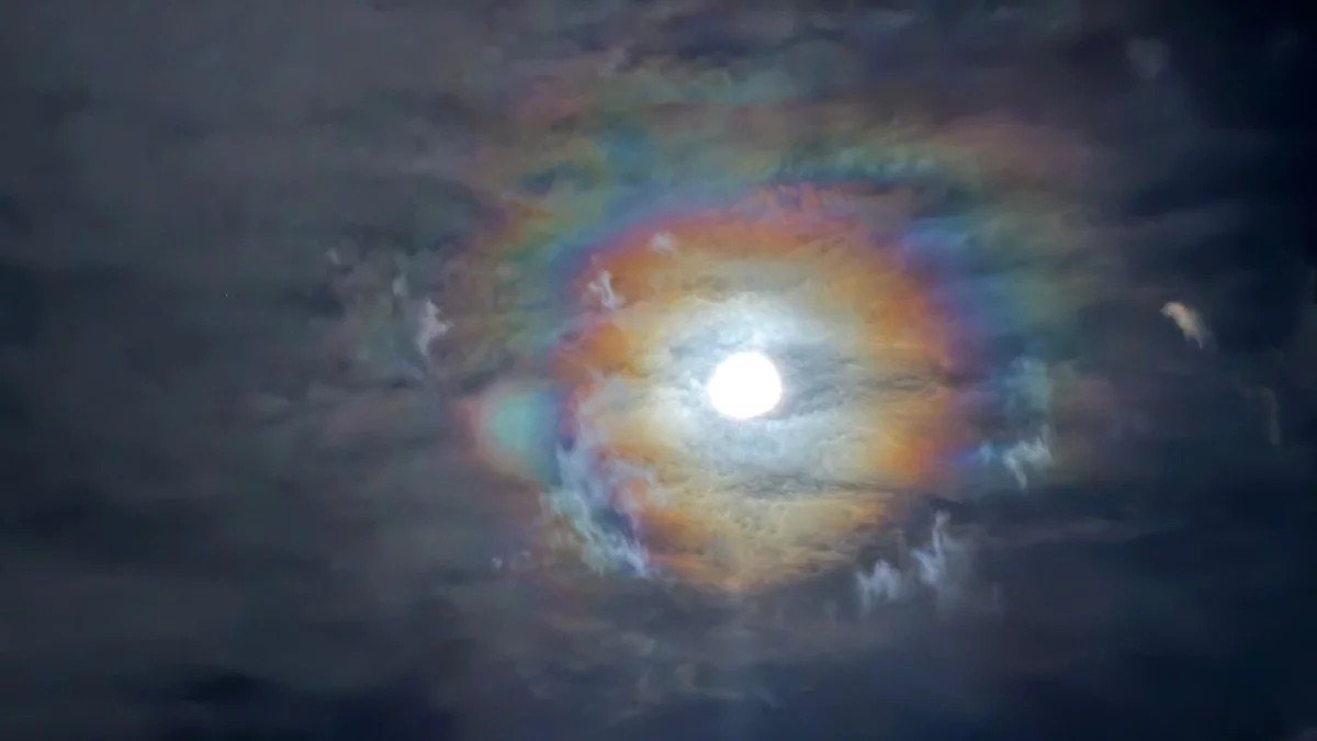 Korona księżycowa, zwana także tęczą wokół księżyca, to optyczne zjawisko powstające wskutek dyfrakcji światła księżycowego na drobnych kroplach wody lub kryształkach lodu w atmosferze. W odróżnieniu od halo, które tworzy pierścień o stałej średnicy, korona charakteryzuje się kolorowymi obwódkami w odcieniach czerwieni, żółci i niebieskiego, które otaczają jasny księżyc niczym subtelna tęcza. Najczęściej zjawisko to obserwuje się przy częściowo zachmurzonym niebie, gdy w wysokich chmurach cirrostratus lub w cienkich warstwach mgły unoszą się drobne cząsteczki wody lub lodu, rozpraszając światło. Jasność korony zależy od fazy księżyca – najlepiej widoczna jest przy pełni lub niemal pełni, kiedy światło satelity Ziemi jest najbardziej intensywne.