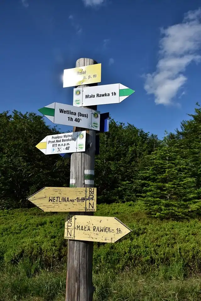 Podejście jest dość łagodne (choć to zawsze kwesta indywidualna) i wiedzie szeroką ścieżką, zalesionym odcinkiem zbocza, aż do połączenia ze szlakiem zielonym przy deszczochronie w szczytowej części Działu. Stąd możecie albo zejść do Wetliny, albo - co polecamy - wędrować dalej w kierunku Małej i Wielkiej Rawki.