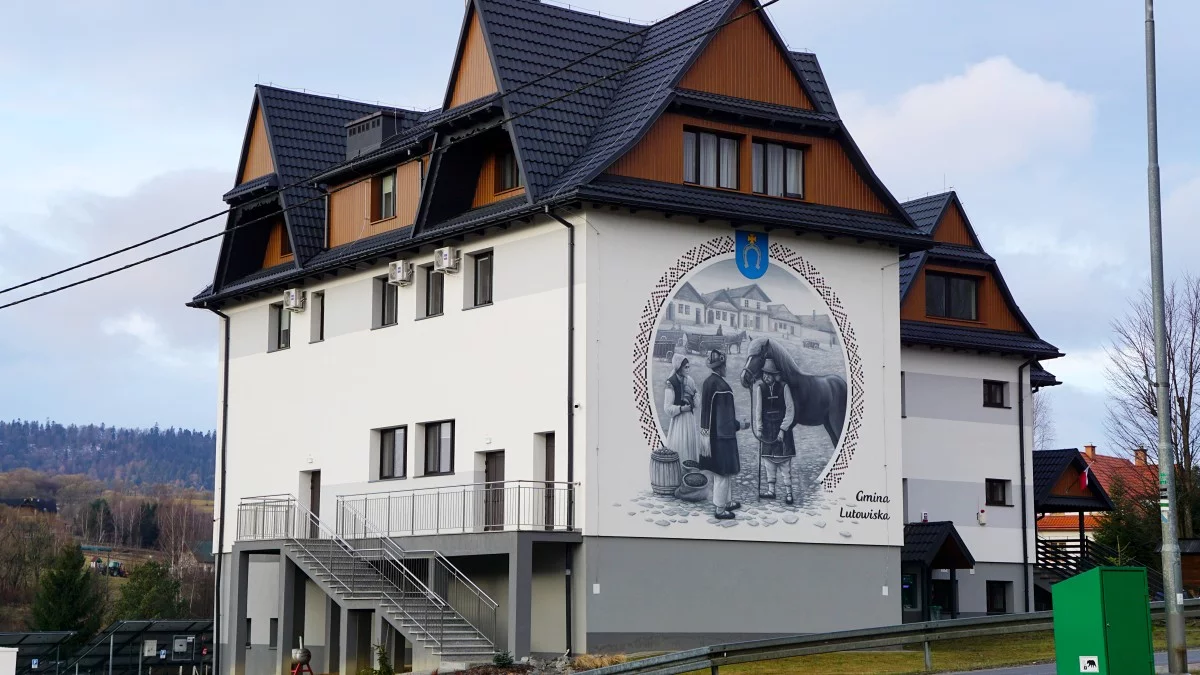„Wizualna podróż w czasie” – tak najprościej można określić mural, który zdobi elewację urzędu gminy w Lutowiskach. Przedstawia on dawną pierzeję rynku, oddając atmosferę handlowej aktywności i codziennego życia sprzed lat. Jest to swoiste przypomnienie, że niegdyś Lutowiska miały status miasta i były ważnym punktem na skrzyżowaniu szlaków handlowych prowadzących z Sanoka do Siedmiogrodu oraz z Przemyśla przez Przełęcz Użocką do Użgorodu. Na pierwszym planie widoczni są kupcy przy straganach oraz kobieta ubrana w tradycyjny strój, co jeszcze mocniej podkreśla historyczny charakter sceny. To swoiste „okno w przeszłość”, które pozwala poczuć atmosferę minionych czasów i refleksyjnie spojrzeć na korzenie tej miejscowości. Dzieło jest zamknięte w dekoracyjnej ramie inspirowanej tradycyjnym haftem karpackim, co dodatkowo podkreśla jego regionalny kontekst.