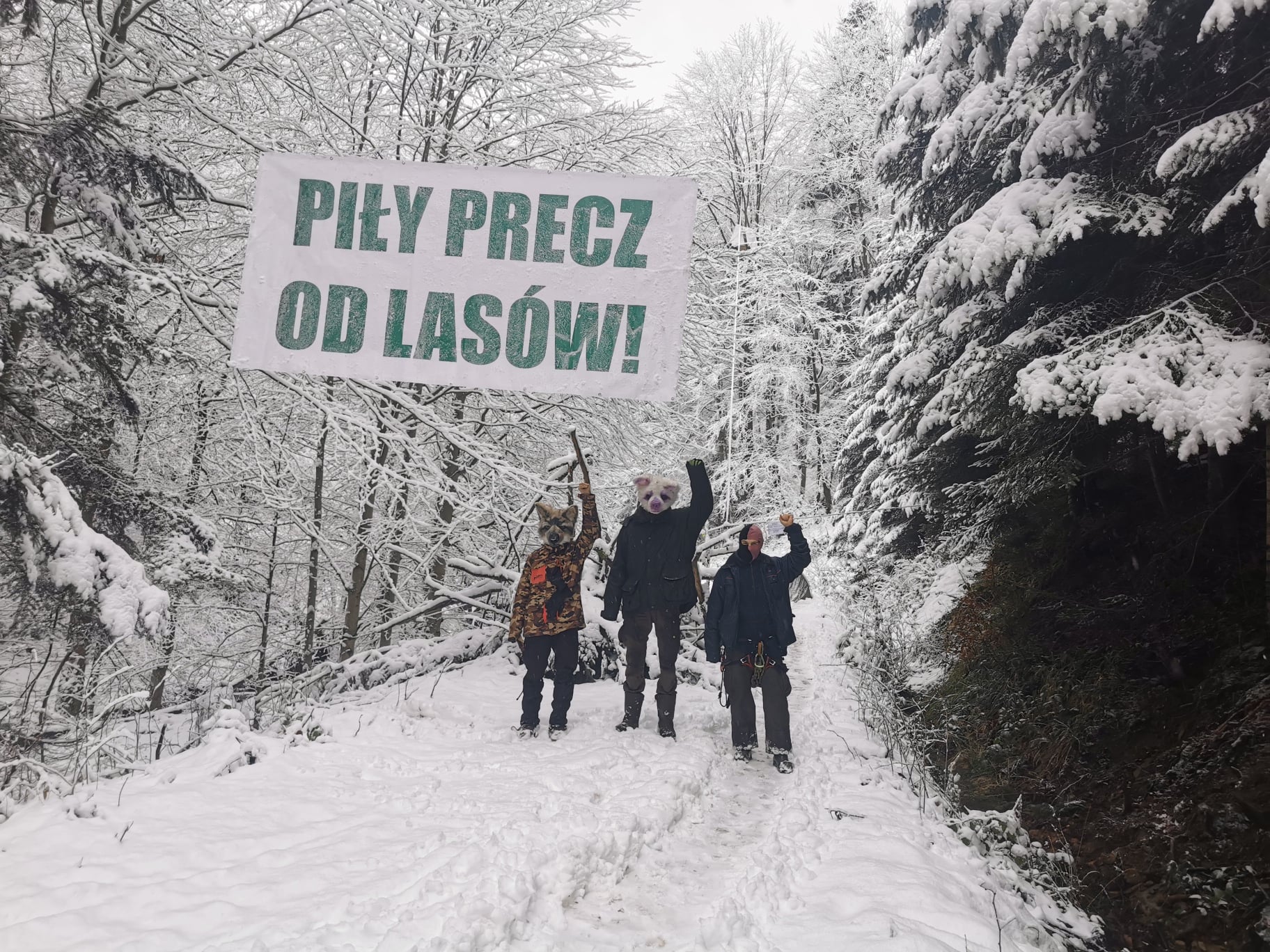Aktywistki zablokowały drogę dojazdową do zagrożonego wydzielenia tworząc pomysłowe, podniebne konstrukcje. Wyposażone w sprzęt umożliwiający stworzenie infrastruktury niezbędnej do przetrwania zimy w górach, zapowiadają okupację do momentu zapewnienia ochrony puszczy przed dalszą wycinką.
