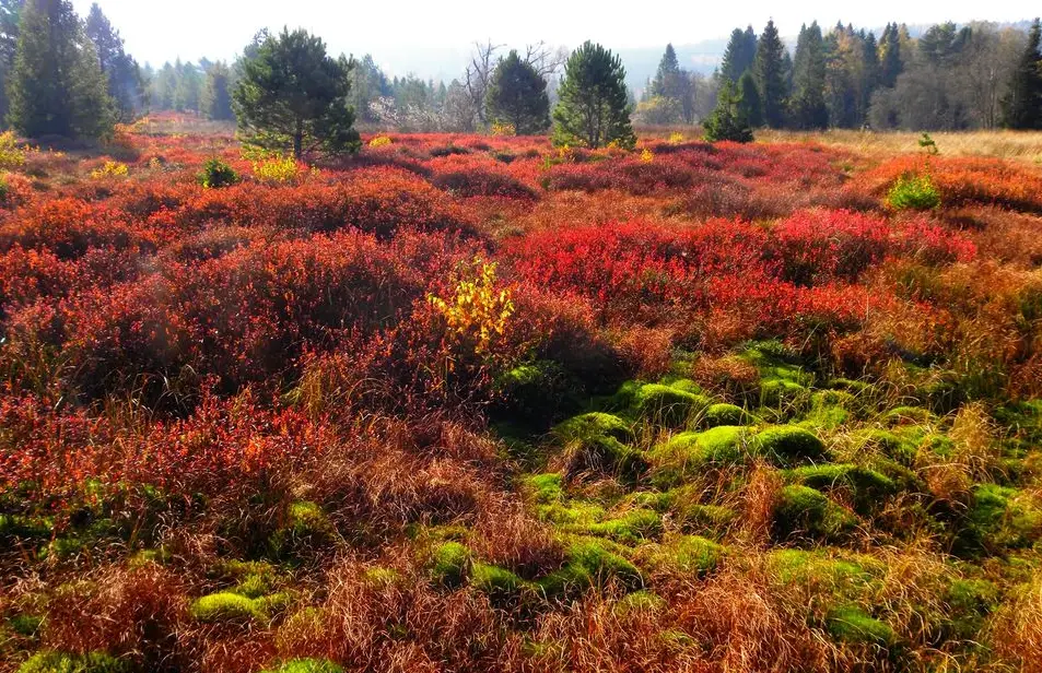 Drzewa i krzewy przyjmują bajecznie kolorową szatę dzięki obecności żółtych ksantofilów, pomarańczowych karotenów i czerwonych lub purpurowych antocyjanów. Efekt wzmocnia jeszcze zróżnicowana żywotność chloroplastów, wśród których niektóre wciąż generują żywozielone plamy.