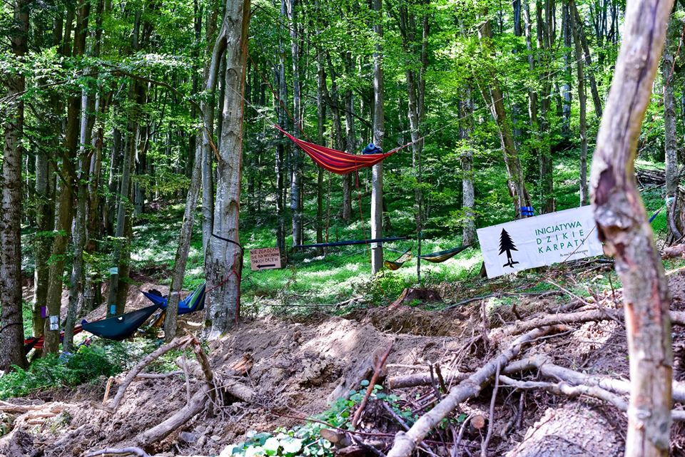 Ekolodzy z Inicjatywy Dzikie Karpaty rozwiesili na terenie lasu hamaki i będą blokować w nich wycinkę oraz drogi zrywkowe. Na miejscu jest ponad 30 osób związanych lub sympatyzujących z IDK.