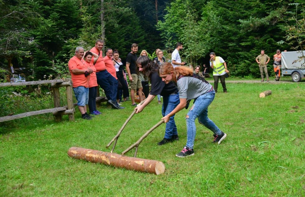 Po ponad godzinnym marszu wszyscy ponownie spotkali się przy wiacie na wspólnym posiłku, po którym miał miejsce kolejny punkt programu czyli „Jak drwal z leśnikiem” – pokaz ścinki i legalizacji drewna. Ta część wydarzenia również wywołała ogromne emocje oraz zainteresowanie uczestników. Całe postępowanie, czyli podjęcie decyzji o wycince konkretnego drzewa, szacunki brakarskie, przygotowanie stanowiska oraz przeprowadzenie ścinki zgodnie z zasadami BHP, a także legalizacja drewna przez leśniczego i kontrola takiego sortymentu, zostały opatrzone komentarzem inżyniera nadzoru Teodora Fursa