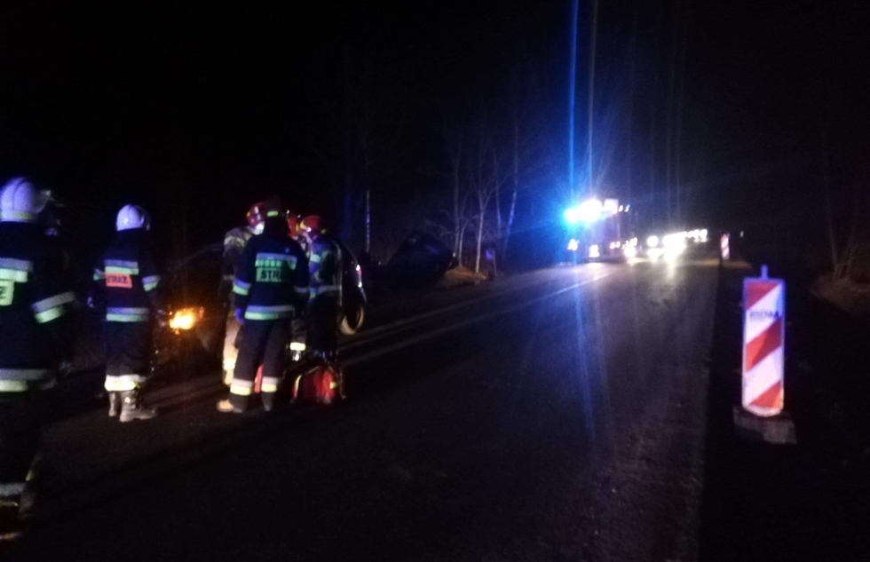 W wyniku zderzenia dwóch samochodów osobowych, jeden z nich wywrócił się kołami do góry.